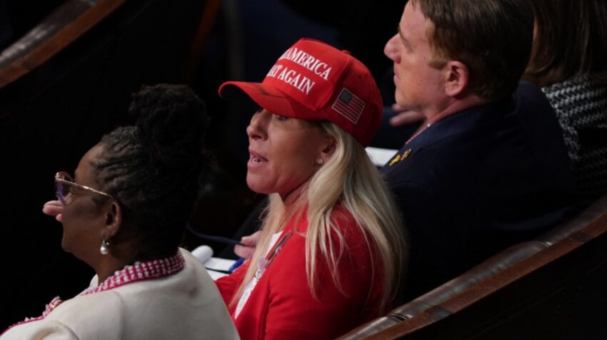 Greene wore a red “Make America Great Again” hat as she sat in the chamber.