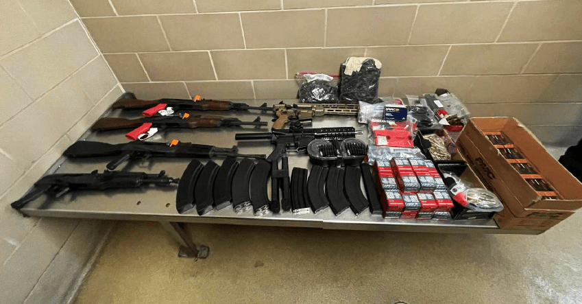 Court records identify the firearms as six rifles and six handguns; a photo of the weapons shows several banana clips typically used for AK-47-style assault rifles.