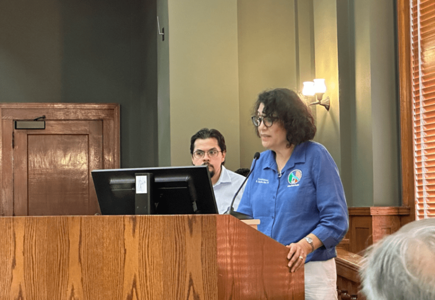 U.S. International Boundary and Water Commissioner Maria-Elena Giner speaks to a private meeting with leaders of the Rio Grande Valley in Brownsville, Texas, about ongoing negotiations with Mexico to pay water it owes the United States. (Photo Courtesy IBWC)