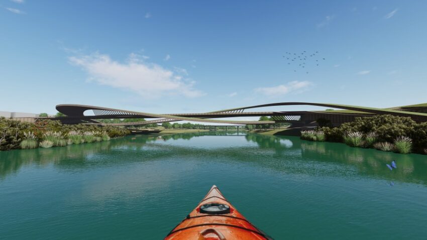 An architectural schematic shows an aerial view of the proposed Binational River Project between Laredo, Texas, and Nuevo Laredo, Mexico. (Renderings courtesy of Overland Partners Architects in collaboration with Able City)