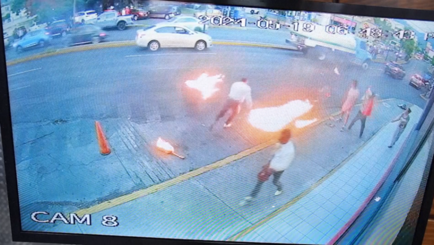 The video then shows the mariachis — some with clothing in flames — running away. The flame-swallower had doused them with flammable liquid from a small can and set them alight. The mariachis quickly shed their clothes or extinguished the flames. None returned to the fight.