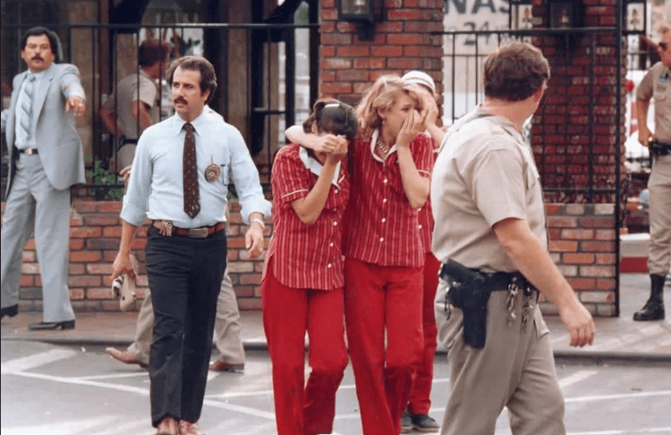 Wendy Flanagan, on the right, is escorted out of the San Ysidro McDonald’s by police officers and detectives. (AP News)