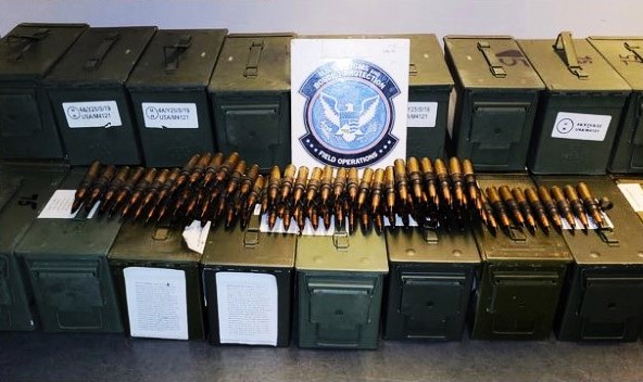 According to records in U.S. District Court for the District of Arizona, officers with U.S. Customs and Border Protection last January stopped a vehicle trying to leave the United States through the Mariposa port of entry in Nogales, Ariz. An inspection revealed the vehicle concealed several boxes of .50-caliber ammunition typically used for a sniper rifle or machine guns. CBP tweeted a photo of green boxes of ammo seized on Jan. 20 and referred to them as armor-piercing and incendiary rounds.