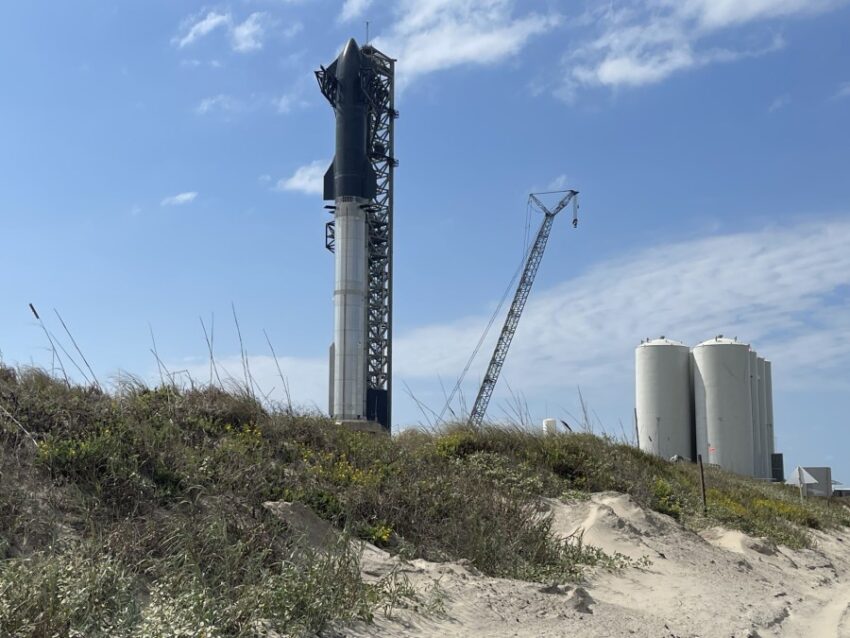 Spacecraft are stacked Nov. 1, 2023, at SpaceX’s South Texas launch facility near Boca Chica Beach, Texas. (Sandra Sanchez/Border Report)
