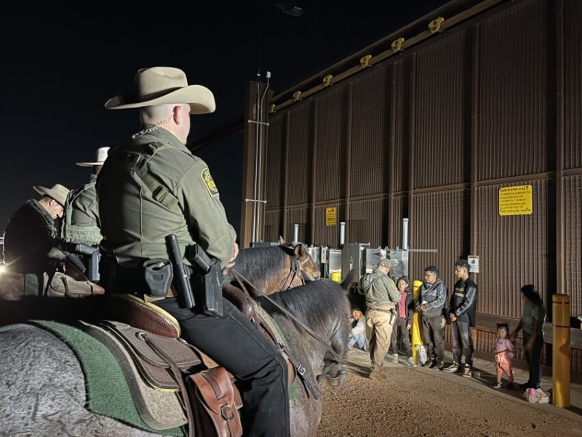 Border Patrol agents on horseback monitor a group of migrants on Oct. 10, 2024, who were arrested near Peñitas, Texas. (Sandra Sanchez/Border Report)