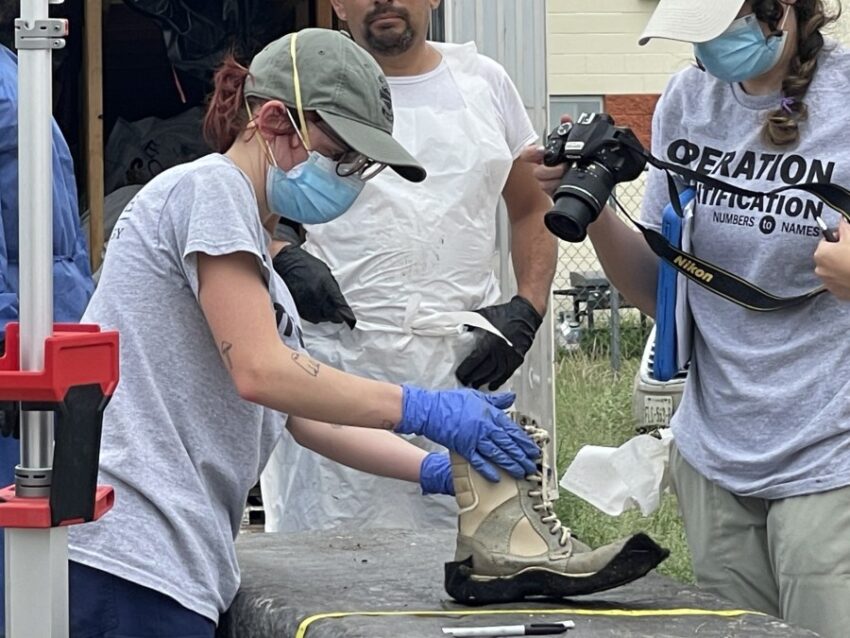 Operation Identification workers from Texas State University work in the pre-dawn hours on Sept. 19, 2024, photographing shoes and other remains from unidentified bodies stored in the Maverick County mobile morgue outside Eagle Pass, Texas. (Sandra Sanchez/Border Report Photo)