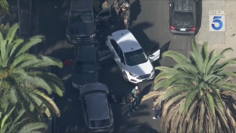 KTLA captured aerial footage from Sky5, which showed what appeared to be federal vehicles that had boxed in another vehicle, a tactic that has been used during the ongoing immigration raids.