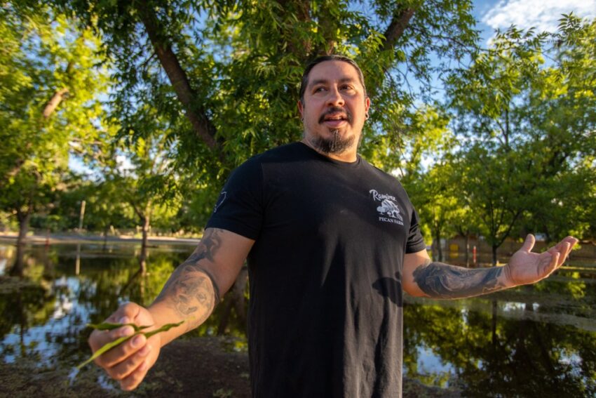 Ramirez was flood irrigating his trees at Ramirez Pecan Farm that morning. The family-run farm, located in the small town of Clint east of the El Paso city limits, has 300 trees whose fruit are small and green in the summer. As the pecans ripen, the husks will turn brown and crack open, ready for harvest in late fall and winter.