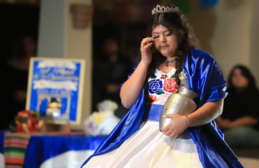 SOCORRO, Texas – Karina García clutched the metal urn carrying her father’s ashes and she swayed alone on the dance floor at El Campanario Ballroom for the last family waltz of her quinceañera on Saturday night.