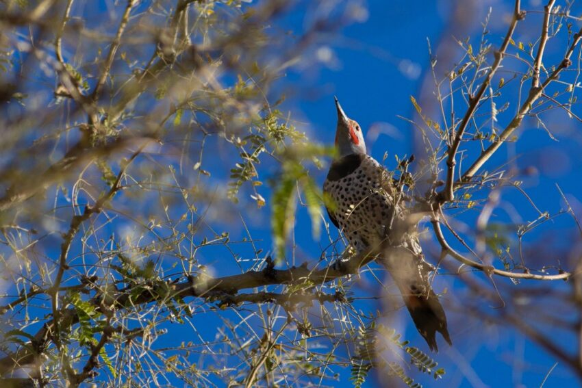 After taking a moment to admire the juncos, Estrella Posada made her way down the Central El Paso park with a pair of binoculars and a DSLR camera slung over her shoulders, a well-thumbed copy of “The Sibley Guide to Birds” in one hand. Posada, a field trip coordinator for the El Paso/Trans-Pecos Audubon Society, followed a flash of vermillion – the northern flicker, a type of woodpecker, landed on a honey mesquite tree.