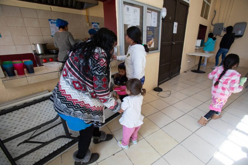 Families who are staying at the Buen Samaritano shelter eat lentil soup for lunch, Jan. 14, 2025. Juan Fierro, the shelter director, said that he now believes none of his current families will get a CBP One appointment due to the incoming Trump administration. (Corrie Boudreaux/El Paso Matters)