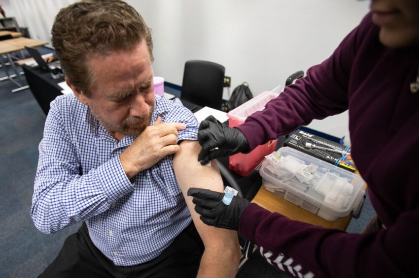 Eddie Romero, an employee of Ysleta ISD, receives a Covid-19 vaccination from Immunize El Paso during an event for district employees on Dec. 19. (Corrie Boudreaux/El Paso Matters)