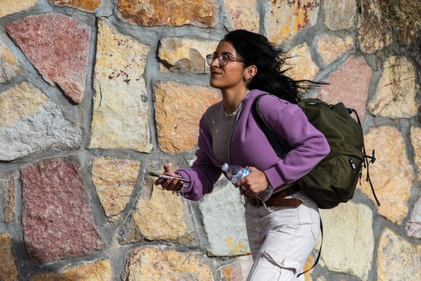 A pedestrian in downtown El Paso wears a mask to protect against dust and debris stirred by high winds, Feb. 17, 2026. (Corrie Boudreaux/El Paso Matters)