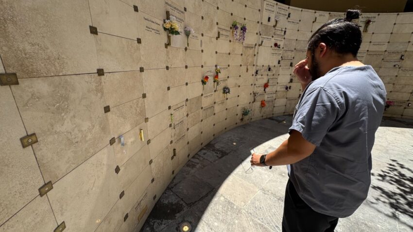 CIUDAD JUÁREZ – Norma and her son Erick stood before a wall of niches in an outdoor courtyard at Mausoleos Luz Divina. For a few moments, Erick was silent and unmoving as he looked at an unmarked plaque that was supposed to bear his father’s name. Then, his body heaved with a sudden intake of breath. He removed his glasses and wiped his eyes, shoulders trembling.
