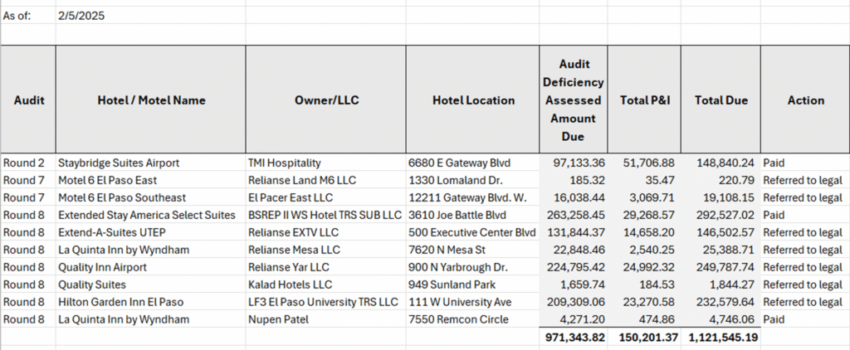 We filed a public information request and obtained the names of the 10 offending hotels from the March audit. Three of them (Staybridge Suites Airport, Extended Stay America Select Suites, and La Quinta Inn by Wyndham at Remcon Circle) paid the balances due but seven others were referred to Legal for collection as of February 5: Motel 6 El Paso East, Motel 6 El Paso Southeast, Extended_A-Suites UTEP, La Quinta Inn by Wyndham at N. Mesa St., Quality Inn Airport, Quality Suites, and Hilton Garden Inn El Paso.