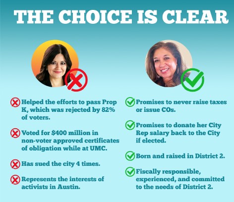 The reverse side of the mailer compares her to Judy Gutierrez, who has promised never to never vote to raise taxes or issue COs and to always act in a manner that is fiscally responsible.