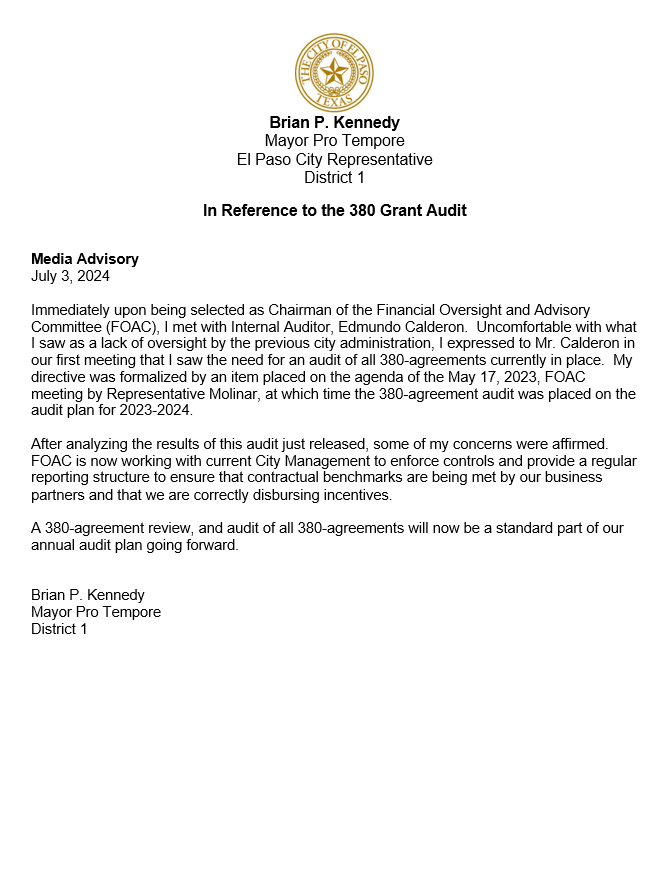 Mayor Pro Tempore Brian Kennedy, who is Chair of the Financial Oversight and Audit Committee, prioritized auditing the 380s shortly after assuming office in January 2023.