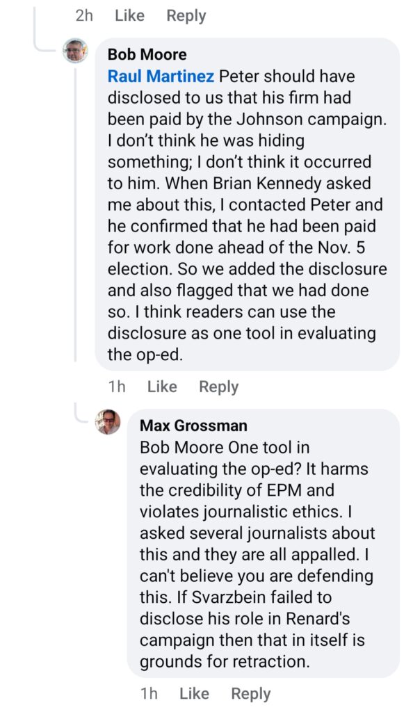 Does Moore really expect us to believe that Svarzbein’s commentary is ethical simply because Johnson’s campaign paid him before November 5? How does he know that he was not paid after November 5?