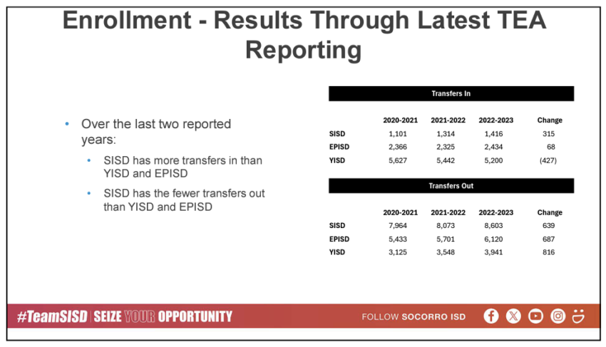 If you think losing 600 students and nearly $4 million is a big deal, tighten your seatbelt because the ride is about to get bumpy, because in reality, the District has lost much more than 600 students. During the March 5 special School Board meeting the Chief Communications Officer and leader of the Public Relations Department, beginning at the 51:45 mark, tried to put a PR face to the issue by choosing to highlight that Socorro ISD had more students transfer into the District than Ysleta ISD and El Paso ISD, with a net change of 315 in the 2020-2021, 2021-2022 and 2022-2023 school years, even though during those years SISD averaged 1,277 students transferring in while EPISD averaged 2,375 and YISD averaged 5,423. He also highlighted that during the same school years SISD had fewer student transfers out of the District, with a net change of 639, even though during these years SISD averaged 8,213 students transferring out. EPISD averaged 5,751 students transferring out, and YISD averaged 3,538 students transferring out.