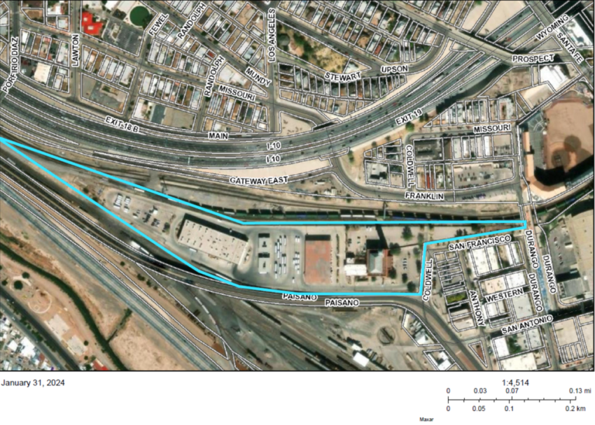 The agenda backup indicates that the new proposed site is immediately to the west of Union Depot, between Sunset Heights and the Border Highway.