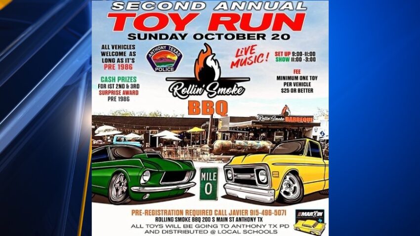 EL PASO, Texas (KTSM) – The community is invited to the second annual Rolling Smoke BBQ Toy Run and Car Show event happening this weekend in Anthony, Texas.