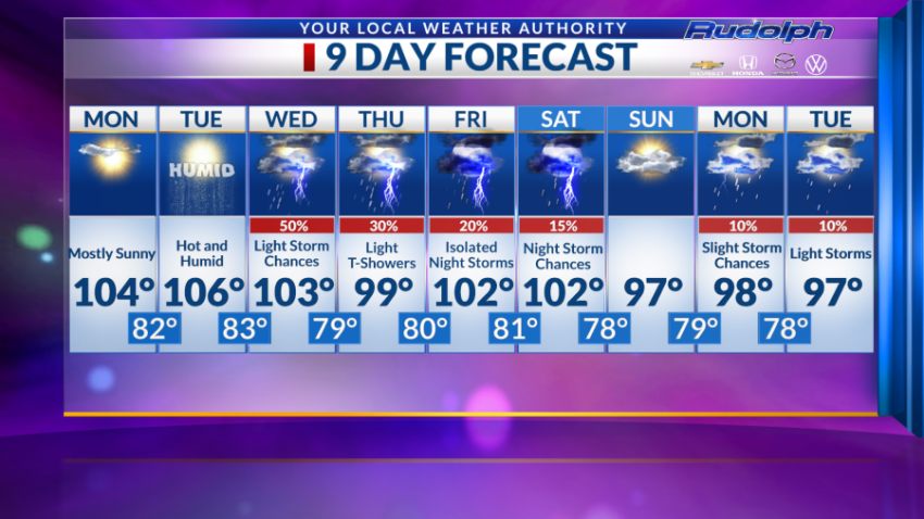 Wednesday, we are forecasting a high of 103 degrees with a 50% chance of storms in the afternoon lingering into the evening. We cool off to 79 degrees at night.