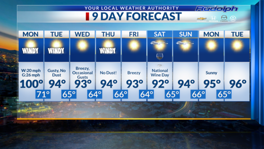 Winds may irritate your allergies, so carry a mask and have your medication on hand. Monday is also a forecasted to reach a high of 100 degrees, our first triple digit of the year.