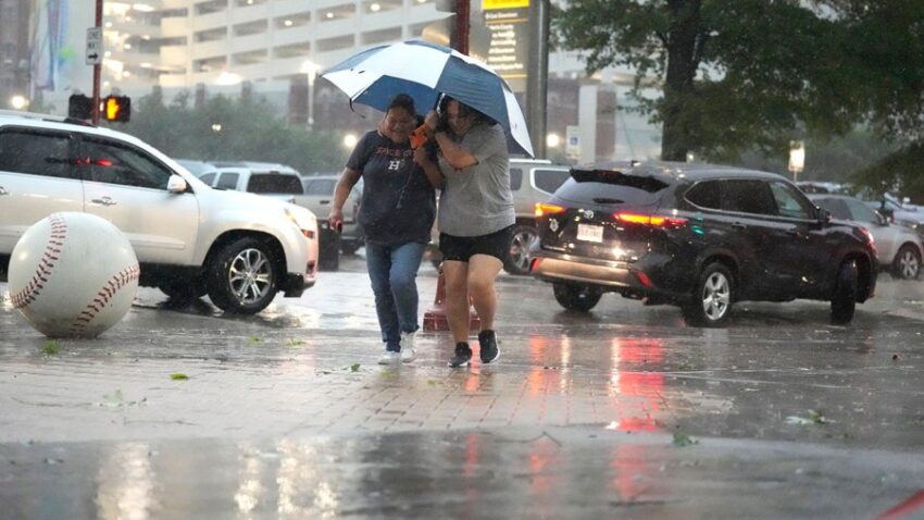 At Minute Maid Park, home of the Houston Astros, the retractable roof was closed due to the storm. But the wind was so powerful it still blew rain into the stadium. Puddles formed on the outfield warning track, but the game against the Oakland Athletics still was played.
