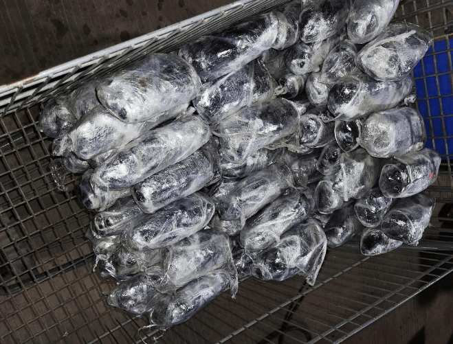 Court records show the CBP officer inspected the vehicle and found anomalies in the back. The officer called for backup and allegedly found 65 black-taped bundles hidden in rear bumper panels. A sampling of the contents found the bundles concealed methamphetamine with a total weight of 34.86 kilograms (76.8 pounds); the driver, passenger and minors were placed in hand restraints and taken to an interview area, records show.