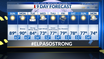 Come Tuesday, a cold front will enter the Borderland. It will bring strong winds up to 25 mph with blowing dust. The high will drop to around 84 degrees, with a low around 56.