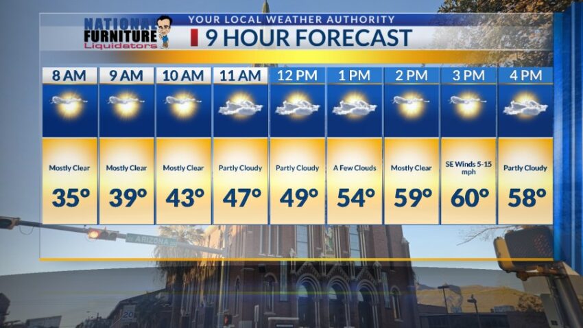 Last night, we had partly cloudy skies that kept us at 32 at the airport. We shall be colder tonight: 29 at the airport, 25 in the valley. But if you like it warmer, here’s your exclusive 9-Hour Forecast for Wednesday with your 9-Day Forecast below. TONIGHT: The skies will be clear overnight, and the […] Read: Read More