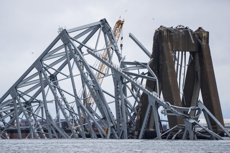 A section of the damaged and collapsed Francis Scott Key Bridge is seen, in the Baltimore port, Monday, April 1, 2024. (Kaitlin Newman/The Baltimore Banner via AP)