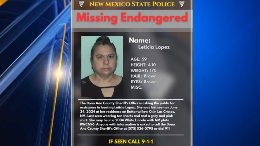 The Sheriff’s Office says Leticia Lopez, 59, was last seen on Monday, June 24, at her residence on Buttonwillow Ct in Las Cruces.