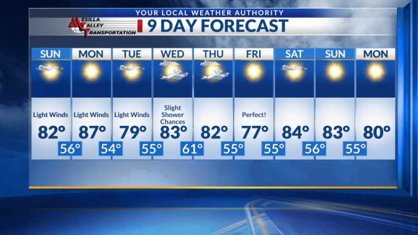 Monday will be even warmer, in the mid- to upper 80s. Again, light winds for a good portion of the day with sunny skies before the lows drop into the 50s.