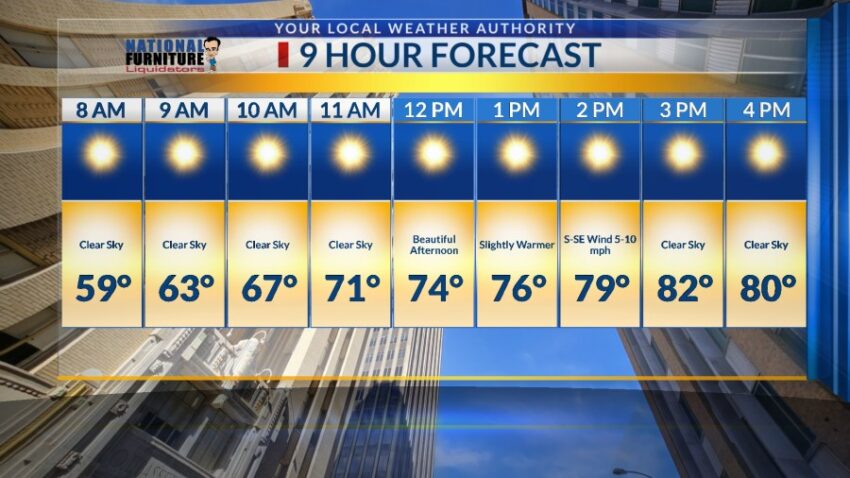 Can I get a show of hands of people who thought today was the most beautiful day in the history of all days ever?? (Violently flailing my hand in the air!) “Me, me, count me!” Just fantastic weather. Today’s high was 78, which is 5 degrees above normal. We get even warmer (although just a gorgeous) through the workweek as a ridge of high pressure takes temperatures way above normal. Here’s your exclusive 9-Hour Forecast with your 9-Day Forecast below.