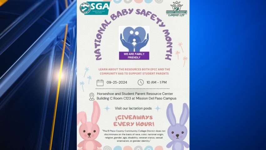 EL PASO, Texas (KTSM) – In celebration of National Baby Safety Month, El Paso Community College (EPCC) will host an event from 10 a.m. to 1 p.m. on Wednesday, Sept. 25 at the EPCC Mission del Paso Campus located at 10700 Gateway Blvd. East.