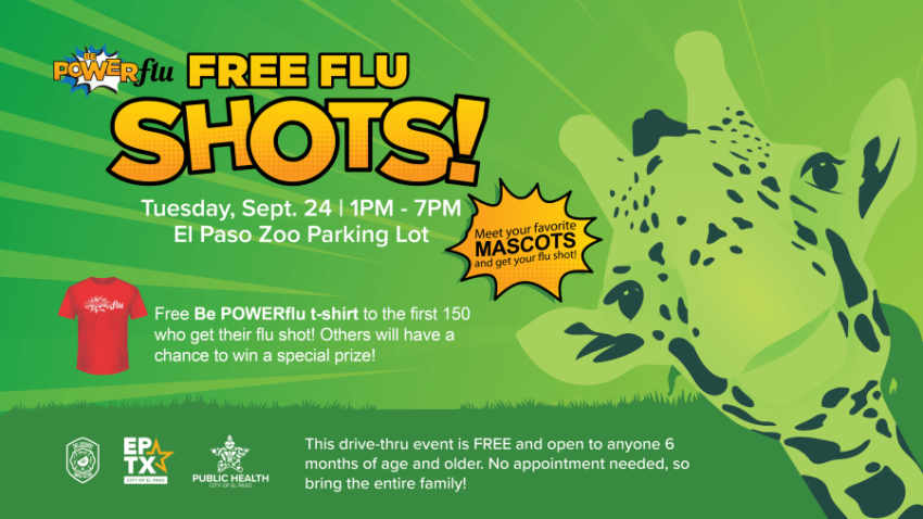 The City of El Paso Department of Public Health and the Fire Department, through the City’s Be POWERflu campaign, will be providing free flu vaccines from 1 p.m. to 7 p.m. on Tuesday, Sept. 24 at the zoo, located at 4001 E. Paisano Dr.