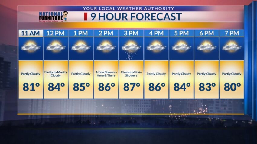 By noon, partly to mostly cloudy skies will linger with a few showers here and there. Chance of rain showers will continue around 3 p.m. with temperatures in the mid-80s making it feel humid. Make sure to plan ahead as showers can disrupt any outdoor activities.