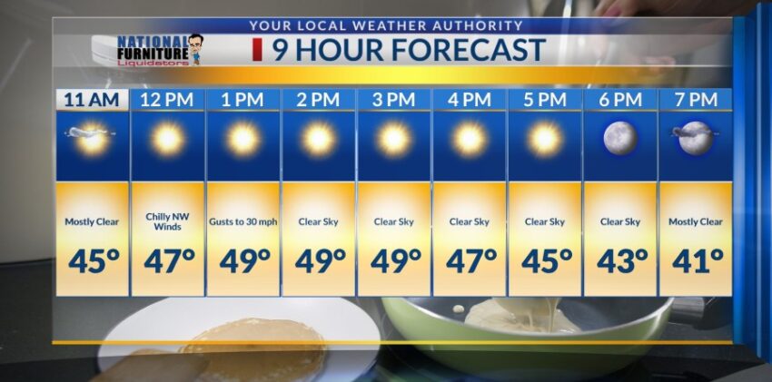 While we’ll begin to see mostly clear skies at 11 a.m. By noon, chilly Northwest winds will pick up with gusts at 30 mph.