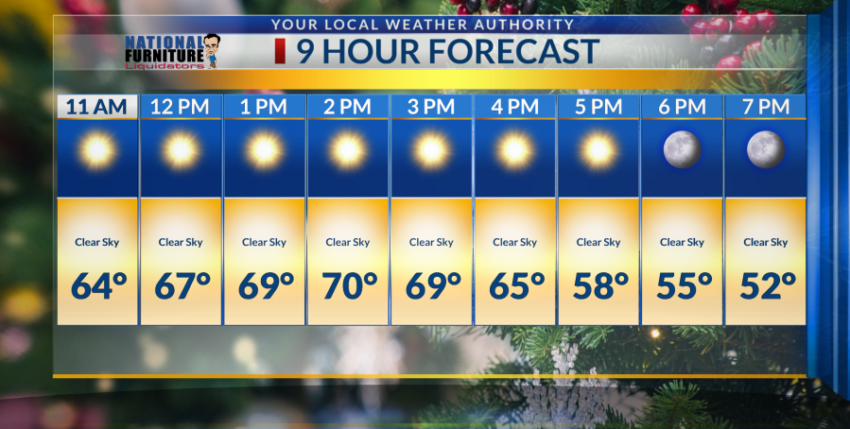 Starting at noon, you’ll begin to feel the day get warmer between 2 and 3 p.m. While we’re forecasting a high of 70-degree temperatures. We’ll begin to drop down to mid 50s in the evening. As for later tonight, we’re expected to drop down to 42 degrees.