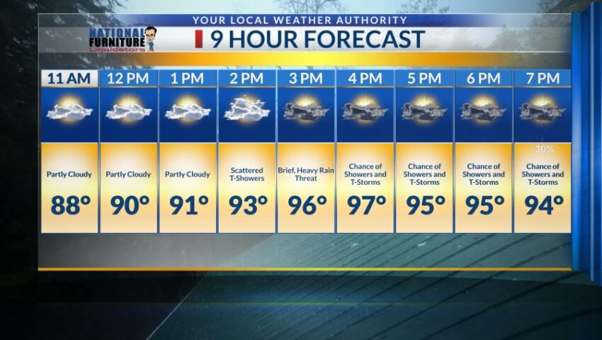 While the morning will start with partly cloudy skies, a few drops will make their way until scattered showers at 2 p.m. Expect a brief heavy rain threat around 3 p.m.
