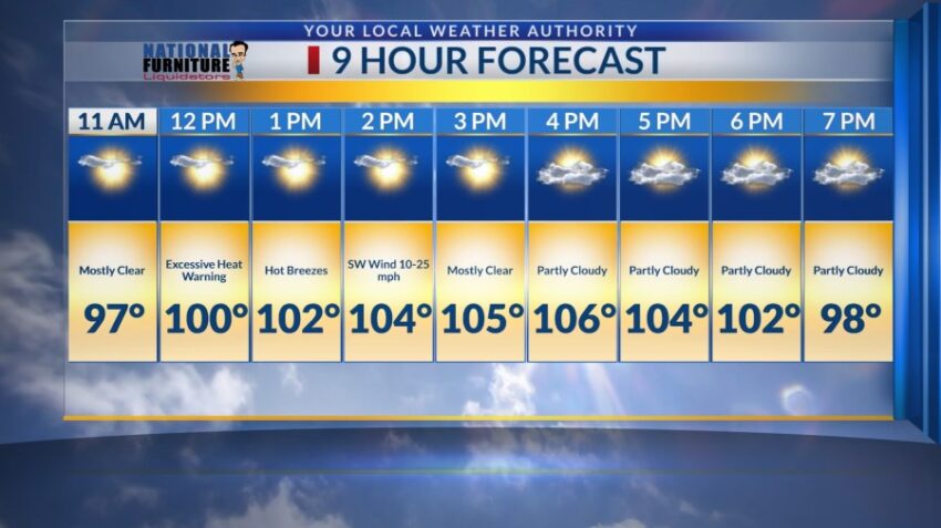 The morning will be very warm with mostly clear skies. Although, there will be a hot breeze with winds at 10 to 25 mph southwest, expect a high of 107 degrees paired with partly cloudy skies around 4 p.m.