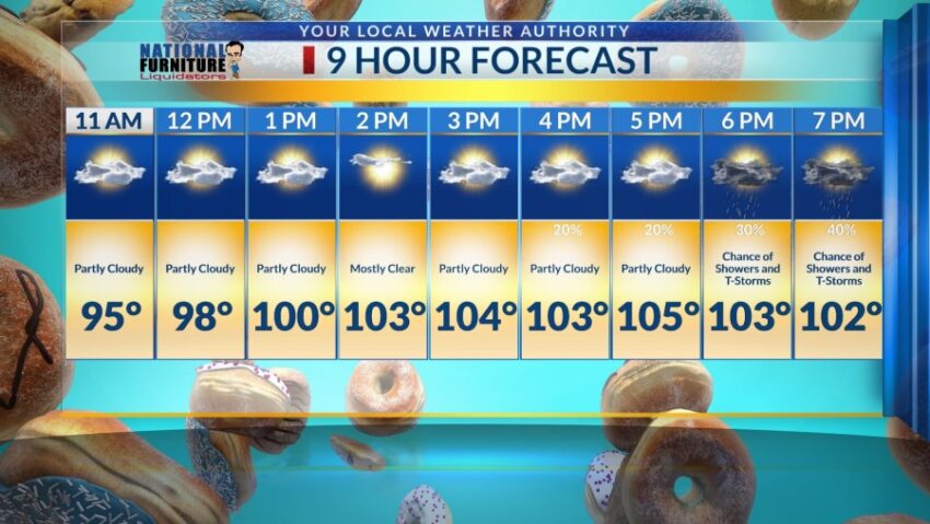 Forecasting a high of 105-degrees in the Sun City, expect partly cloudy skies paired with a 20 percent chance of showers and thunderstorms after 4 p.m.