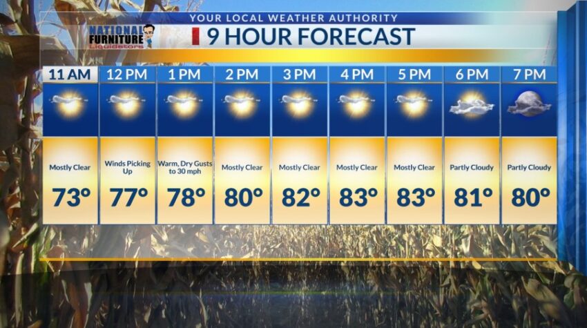 The morning will start off with light southeast winds at 15 to 20 mph but expect south winds to pick up this afternoon with dry gusts at 30 mph. Temperatures are expected to reach 83-degrees by 4 p.m.