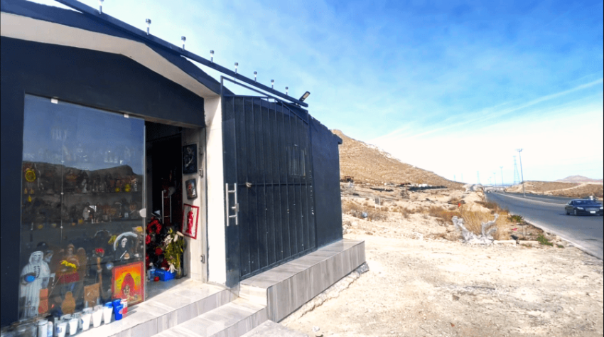 The shrine stands 8 feet tall at the foot of a hill in westernmost Juarez. A black metal gate with a deadbolt lock guards the entrance. Sun-powered lights keep the structure lit at night and what appear to be security cameras watch the sliding glass doors and ongoing construction on the side.