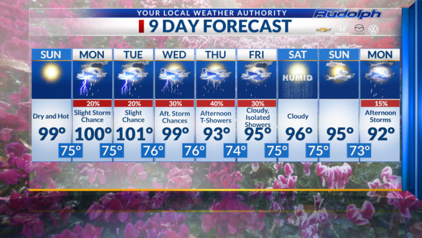 As for Wednesday, we have a 30% chance of afternoon storms once again, with a high of 99 degrees.