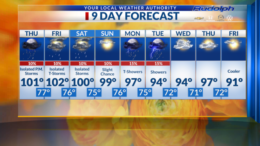 A high of 102 degrees is our forecast temperature for Friday paired with a 10 percent chance of thunderstorms. The pattern of isolated storms will continue for most of the week as well.