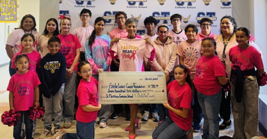 EL PASO, Texas (KTSM) — Students from St. Matthew’s Catholic School made and sold special t-shirts that read “Falcons wear pink” to raise money for the Stand with Estela Casas Cancer Foundation.