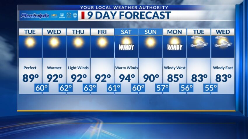 FORECAST: Tuesday will be sunny and nearly perfect with light winds and a high of 89. The SE-south winds will range from 5-10 mph. Wednesday will be sunny with light winds and a high of 92. Thursday will also be sunny with light winds and a high of 93. Friday will be sunny and 93. Saturday will be sunny and 94 with warm southerly winds. Sunday will be sunny and 90. On Monday, the west winds kick in for a cooler day. The eastern slopes will have stronger gusts, and the high will only be 85.