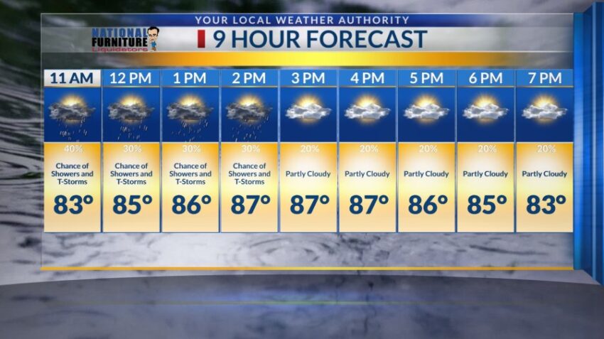 Temperatures will clearly be cooler, no triple digits in sight for the Sun City. However, we are forecasting a high of 87 degrees by 2 p.m. Showers and thunderstorms are expected to die down around 3 p.m. with partly cloudy skies sticking around till the evening.